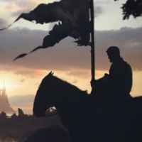 This image features a silhouette of what appears to be a rider on horseback, set against the backdrop of an iconic castle during either sunrise or sunset. The atmosphere suggests a serene and majestic moment captured within a fairy-tale landscape.
