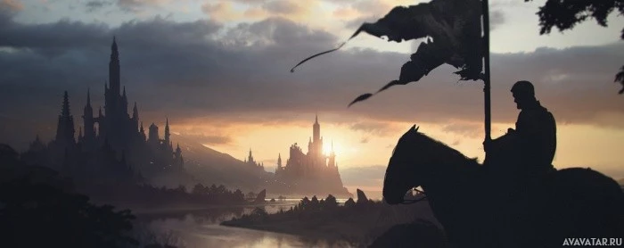 На этом изображении изображен силуэт того, что кажется всадником на лошади, установленный на фоне культового замка во время восхода или заката солнца. Атмосфера предполагает спокойный и величественный момент, запечатленный в сказочном пейзаже.