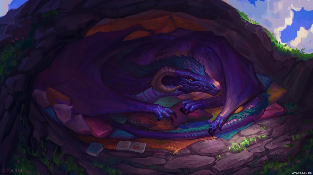 a fantasy scene with a dragon. The dragon is coiled within what appears to be a cave or a hollowed-out tree, surrounded by a variety of