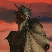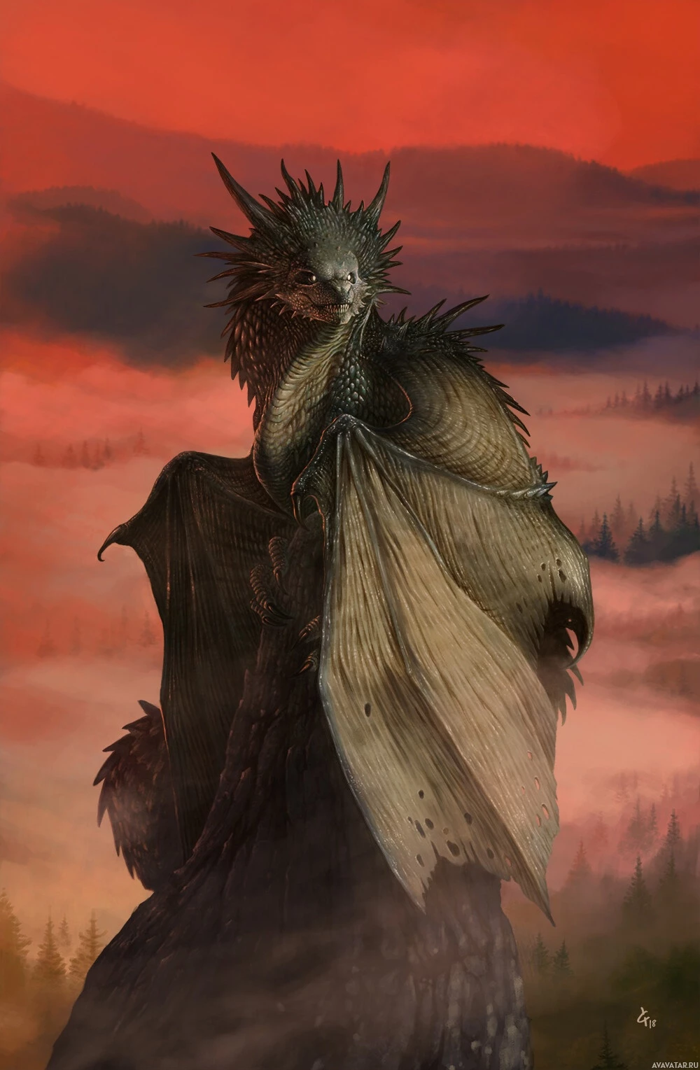 The image depicts a fantasy-themed scene featuring a figure that could be interpreted as a dragon or