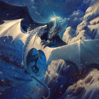 The image shows a fantasy-themed artwork depicting two dragons. One of the dragons has blue and white scales, while the other appears to have silver and darker tones. They are situated in