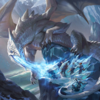 a fantastical scene featuring a majestic dragon as the central figure. The dragon has a detailed and menacing appearance, with scales that appear to be made of ice or a similar