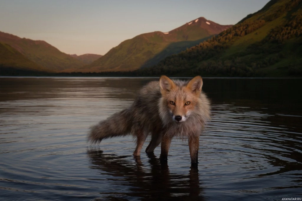 На снимке изображена красная лиса, стоящая на мелководье, возможно, в реке или озере. Лиса смотрит на зрителя и, кажется, спокойно пробирается сквозь воду. На заднем плане изображены горы, предполагая, что эта сцена может происходить в горном регионе.