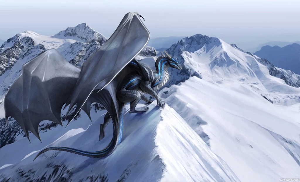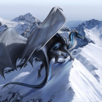 a fantastical dragon soaring over snow-covered mountains. The dragon is depicted with intricate details such as scales, spikes, and wings that are characteristic of mythological or fictional representations of these creatures. The background suggests a cold, high-