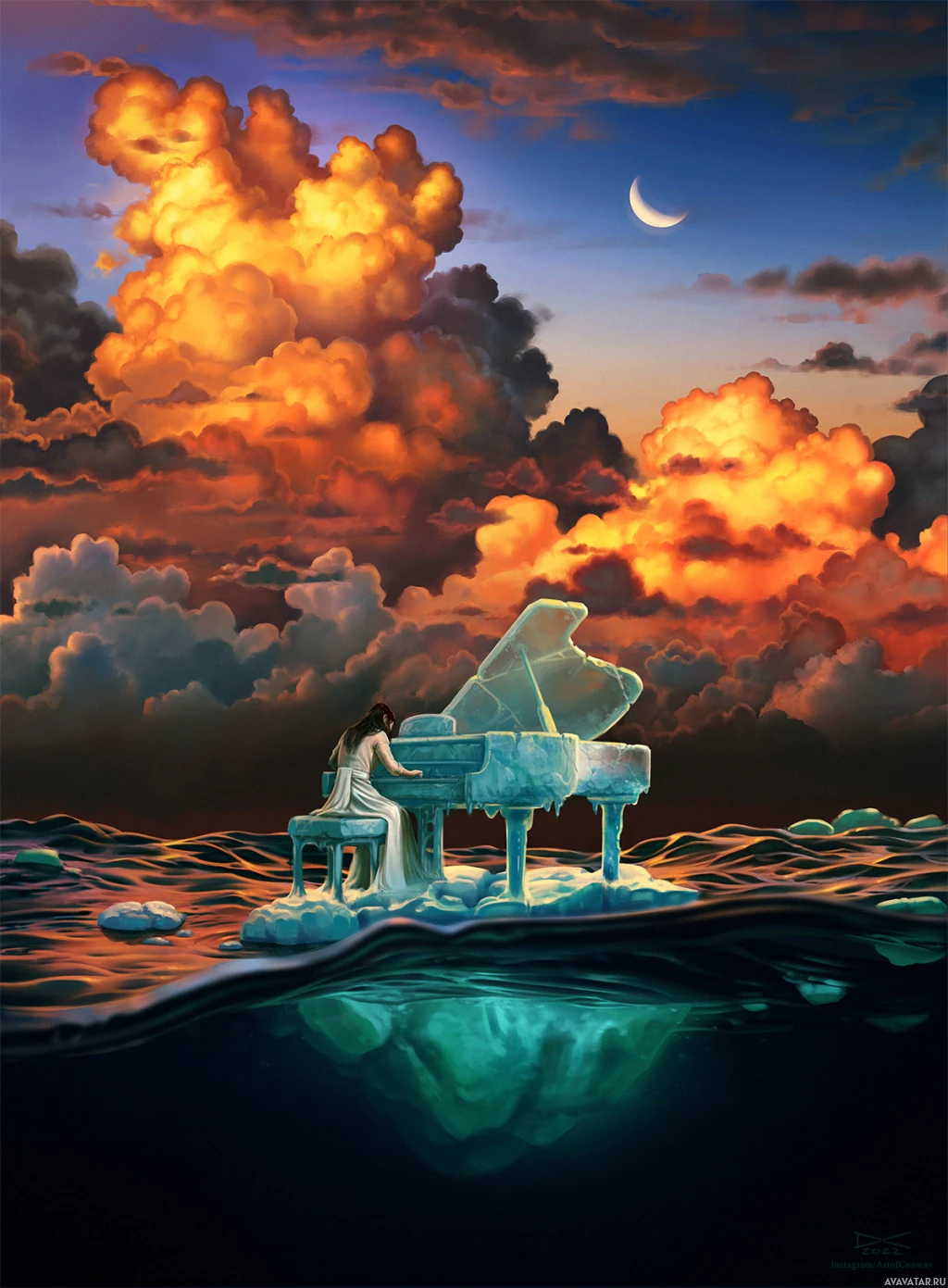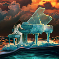 a grand piano on what appears to be an iceberg. She is depicted from behind, and she has long