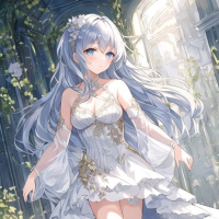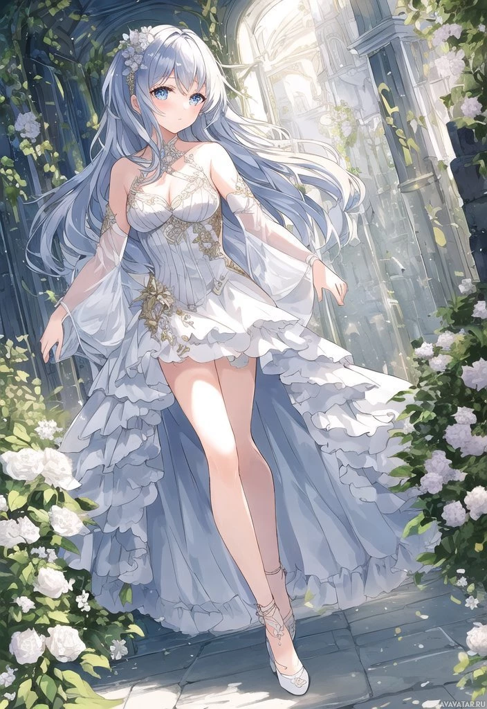 a garden setting, with flowers around her. Her pose and expression suggest she might be dancing or walking gracefully. This