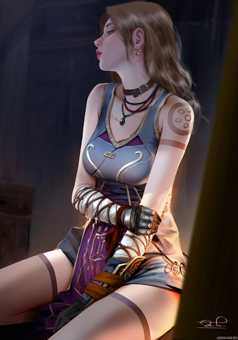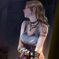 The image depicts a female character with a contemplative expression. She appears to be wearing armor with shoulder guards and has a sword strapped to her side, suggesting she might be a warrior or adventurer. The art style is illustrative and detailed, emphasizing the character's attire and emotional state.