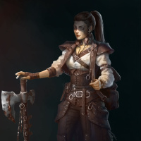 brown hair, and her facial expression seems focused or determined. In her left hand, she holds a weapon that looks like an axe with