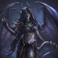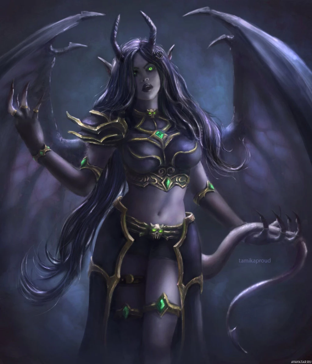 a fantasy character that resembles a succubus. She has dark skin, pointed ears, and sharp fangs, which are common features of this