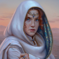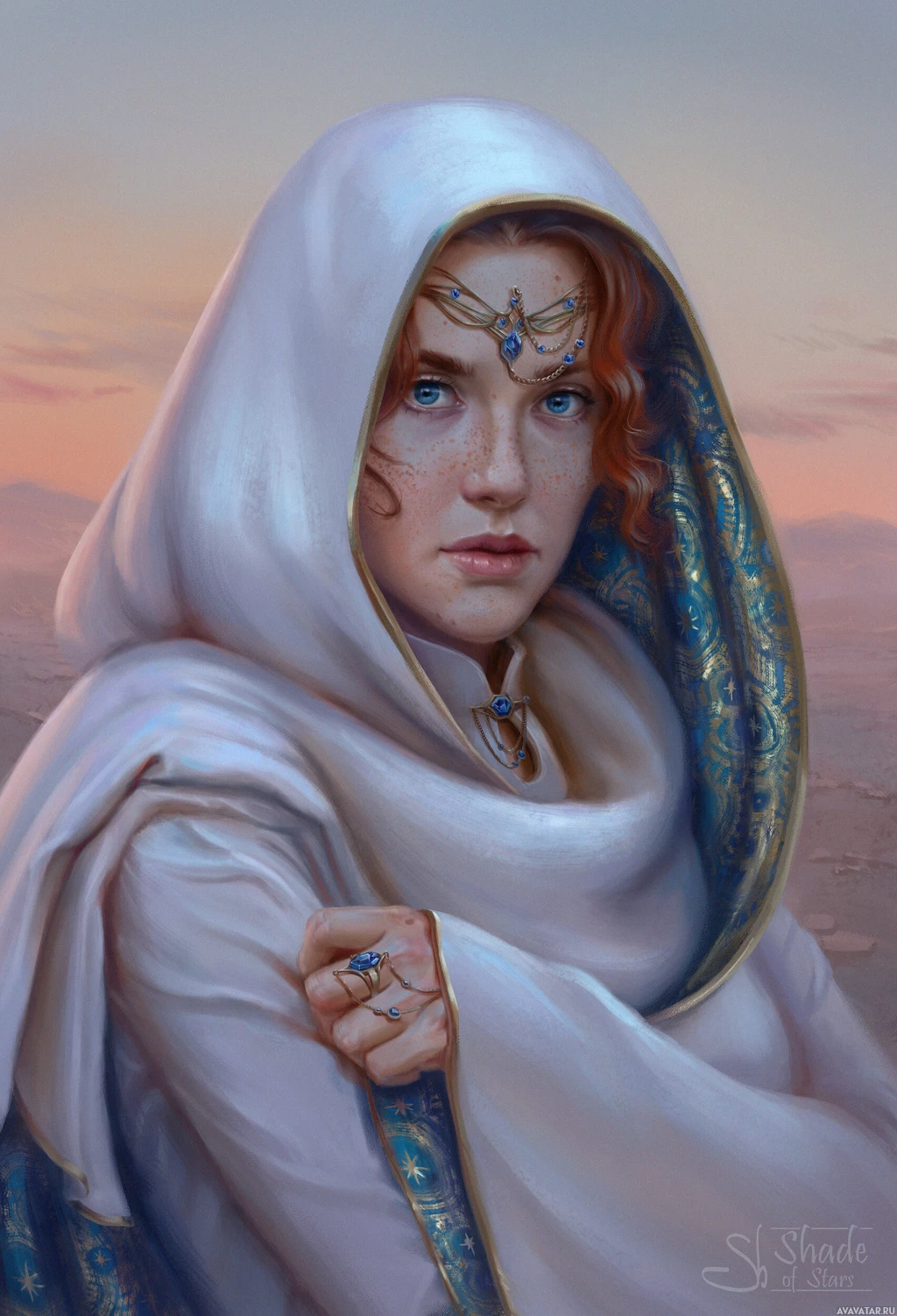 Изображение представляет собой цифровую иллюстрацию персонажа, который выглядит как рыжеволосая девушка в плаще с капюшоном. На лице у нее задумчивое выражение, и она смотрит в сторону, как будто рассматривает что-то вдалеке. Персонаж изображен в фэнтезийной или средневековой эстетике, что наводит на мысль о том, что действие его может происходить в древнем или волшебном царстве.