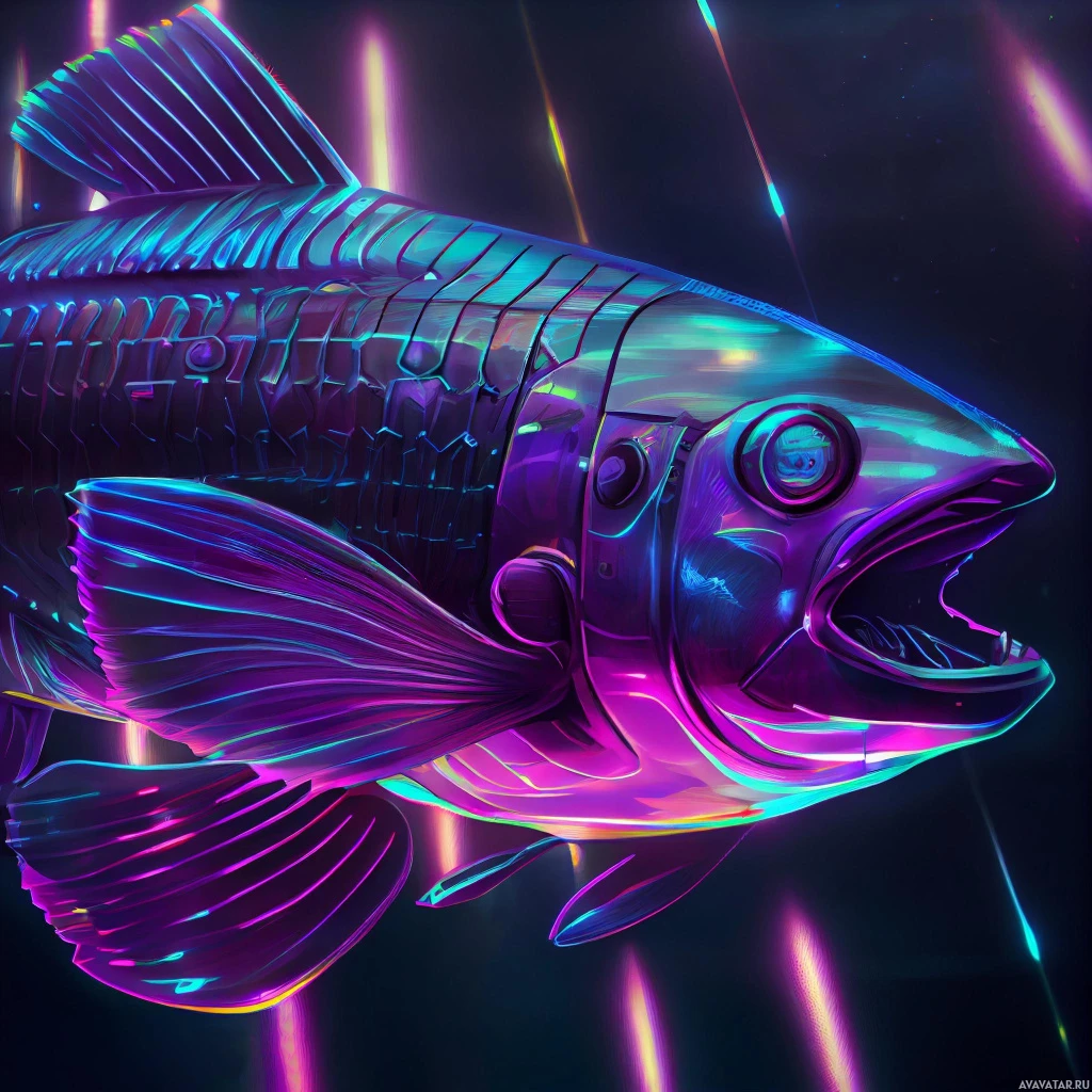 The image features a vividly colored fish with an exaggerated, stylized appearance. It has