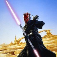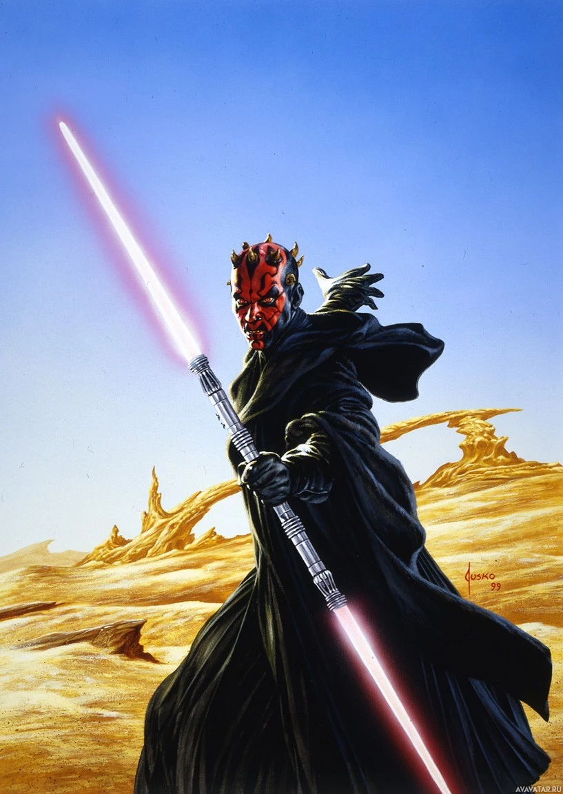 a sandy terrain, reminiscent of scenes from Tatooine or other desert-like environments in the series. Maul is dressed in his signature black and red armor with