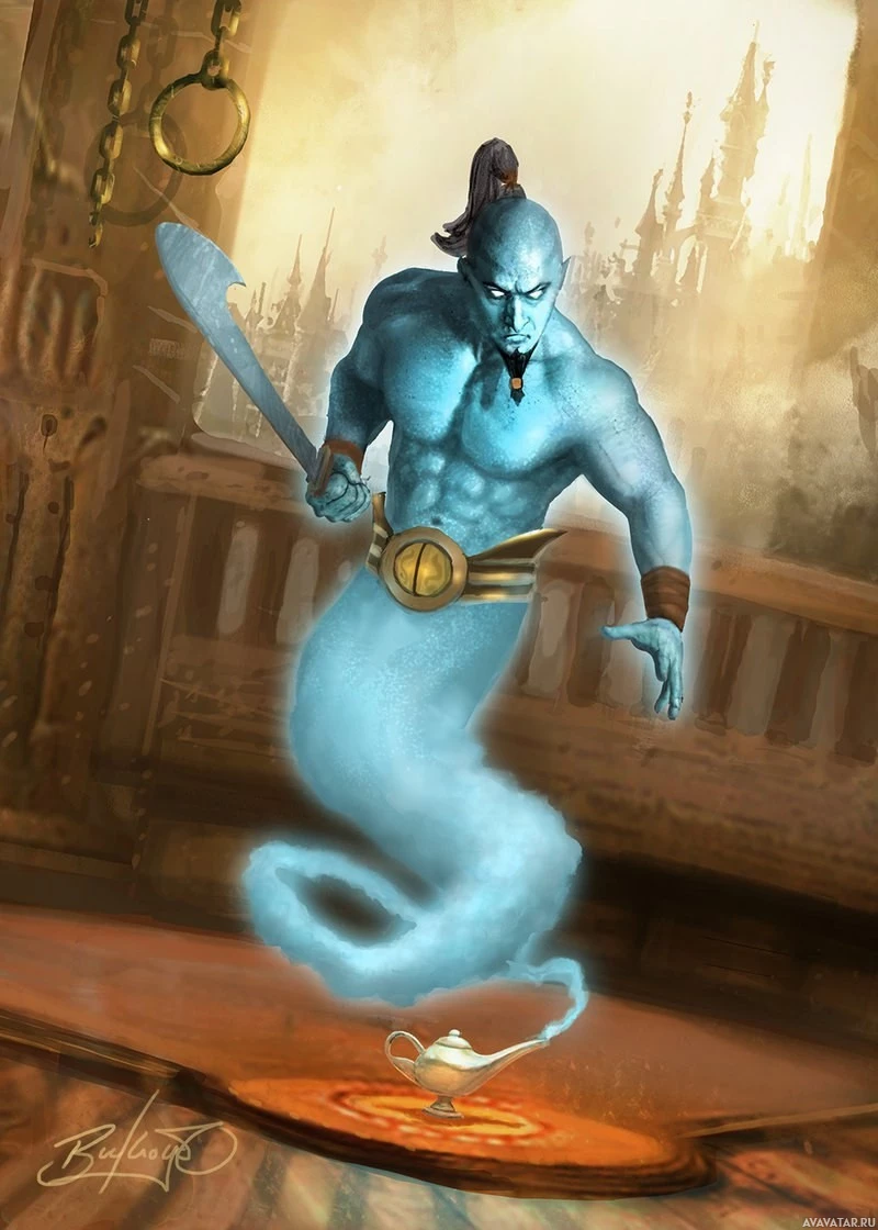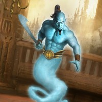 a fantasy scene featuring a character resembling a genie. This figure is blue-skinned and has human-like features, including arms and legs. It appears to be in motion, as suggested by