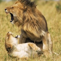 an open field with dry grass. The adult lion appears to be roaring or growling, while the younger lion is lying on its back and looking up at