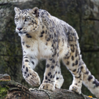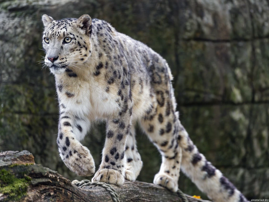 На картинке снежный барс стоит на скалах. Кажется, что животное настороженно смотрит на что-то, возможно, осматривает окрестности или замечает потенциальную добычу. Судя по обстановке, оно может находиться в естественной среде обитания в горном регионе, где обычно обитают эти животные.