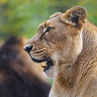 wildlife reserve, given the presence of wooden fencing or posts that suggest boundaries. There is another lion partially visible behind the one in the foreground. The environment looks like it could be a grassy field or savanna-like setting, which would be typical for lions in their