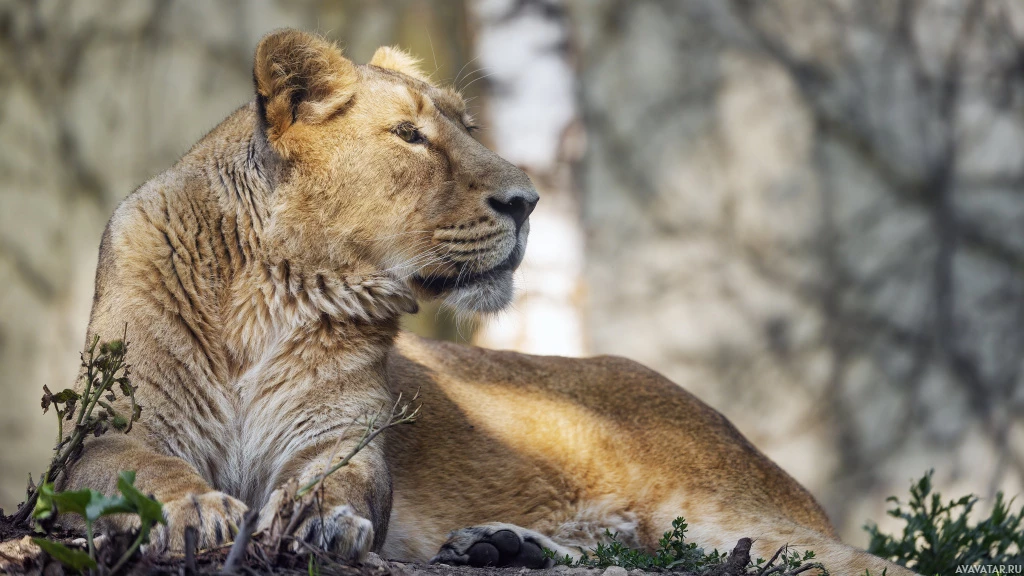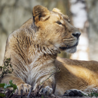 The picture shows a lion sitting on some rocks or