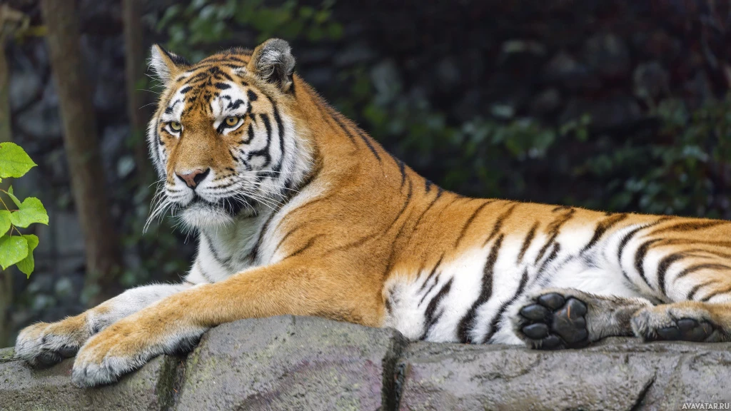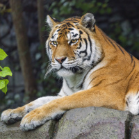 The image shows a tiger resting on rocks. The tiger is lying down with its head upright, looking alert or attentive to something off-camera. There are trees and foliage in the background that suggests
