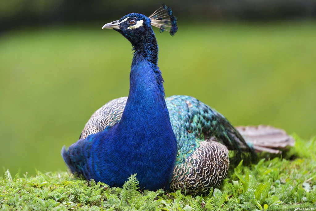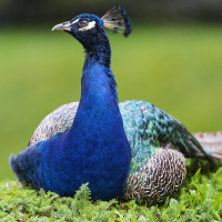 На картинке изображен павлин в его естественной среде обитания. Птица демонстрирует свои яркие перья, которые распущены и напоминают веер. Кажется, что она стоит на травянистой почве на фоне, который может указывать на то, что она находится рядом с водоемом или в саду.