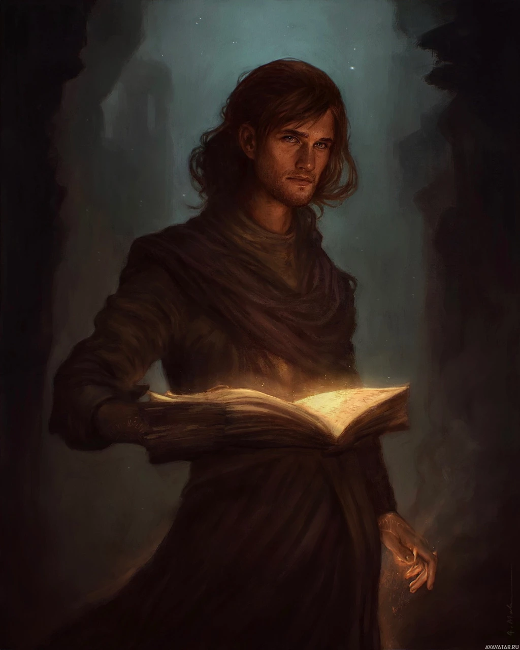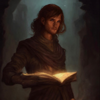 ancient knowledge. The man is dressed in attire that could indicate a scholarly or mystical role, such as a wizard, sorcerer, or alchemist from