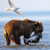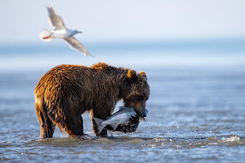 На картинке изображен большой бурый медведь, который с открытой пастью ловит рыбу на мелководье. Над медведем также летает чайка. Судя по всему, это прибрежная зона, возможно, недалеко от того места, где обычно можно найти морепродукты.