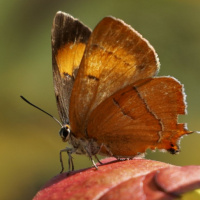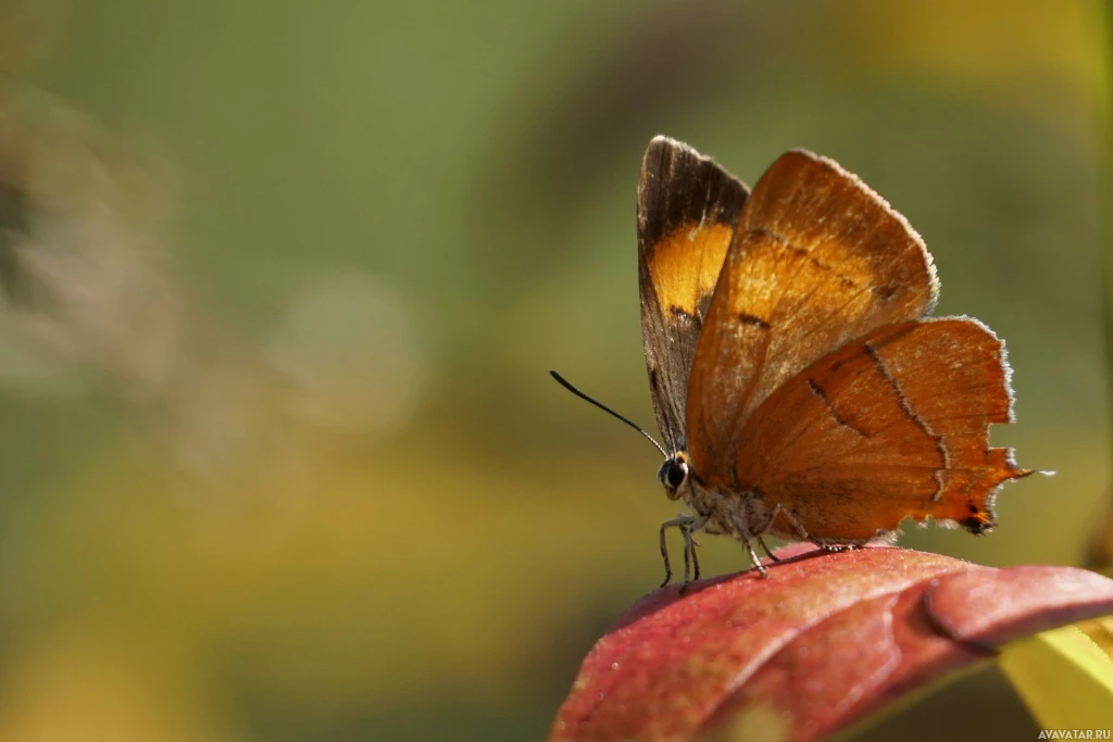 На картинке изображена маленькая бабочка, сидящая на листе, который кажется красным. У бабочки коричневые крылья с более светлыми отметинами, и она сидит в естественной обстановке, которая может быть садом или парком.