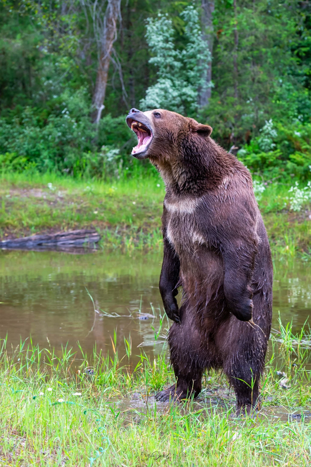 a brown bear standing in what appears to be a natural, forested setting. The bear is on all fours and seems to be looking towards the camera with its mouth open, as if it's vocalizing or showing teeth. There are trees and foliage around, suggesting this could be near a river or stream given
