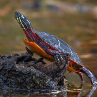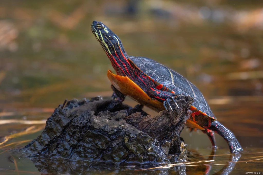 На картинке изображена черепаха в воде, вероятно, в пруду или медленно протекающем ручье. На панцире черепахи есть характерные отметины, которые указывают на то, что это, возможно, взрослая особь, немного потрепанная окружающей средой. Похоже, что она либо отдыхает, либо плывет по поверхности воды. Наличие мха или водорослей на камнях указывает на то, что это пресноводная среда обитания, что характерно для черепах.