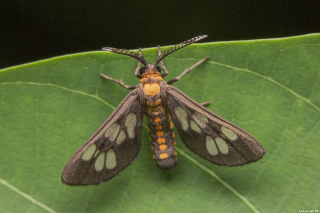 На снимке изображен мотылек, а не бабочка. Для мотылька характерны крылья, которые закрывают тело, и усики, выступающие из верхней части головы. Мотыльки - это насекомые, известные своим разнообразием по размеру, форме и окраске.