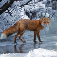 body of water, possibly a river or a lake. The fox appears to be walking across the ice-