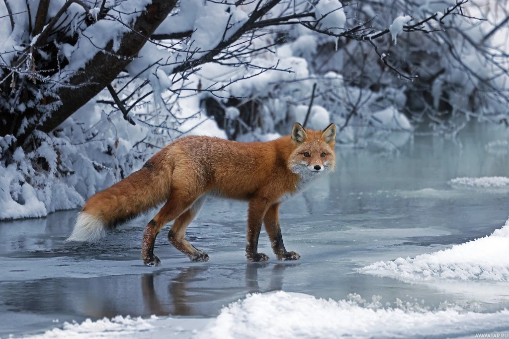 The image shows a fox standing on a frozen