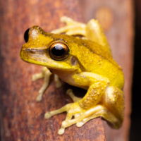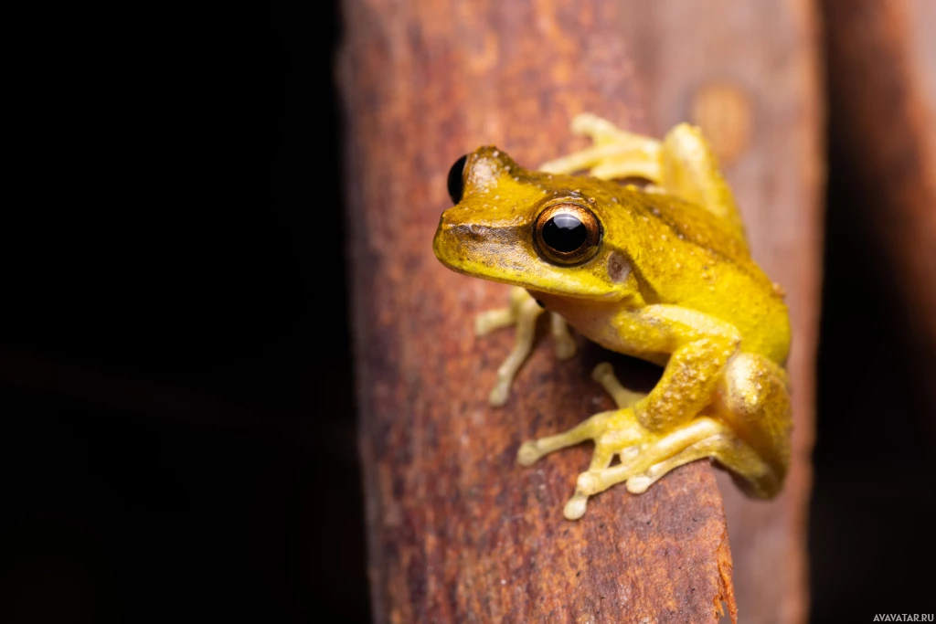 На картинке изображена маленькая зеленая лягушка, сидящая на чем-то похожем на ржавый металлический прут или трубу. Лягушка стоит лицом вперед и смотрит прямо в камеру, благодаря чему хорошо видна ее голова с характерными глазами и узорчатой кожей.