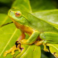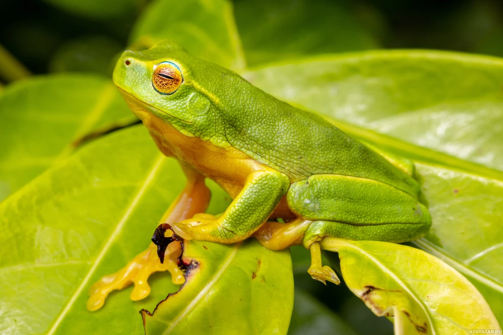 На картинке изображена зеленая лягушка с желтыми отметинами на теле. Кажется, что она отдыхает или сидит на зеленых листьях, что может свидетельствовать о том, что она находится в среде, похожей на джунгли или лес.