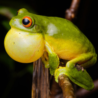 The image features a green frog with prominent orange eyes. It is sitting on what appears to be a twig or branch, which could be part of a tree or shrubbery in its natural habitat. The frog's mouth is slightly open and it seems alert, possibly aware of its surroundings.