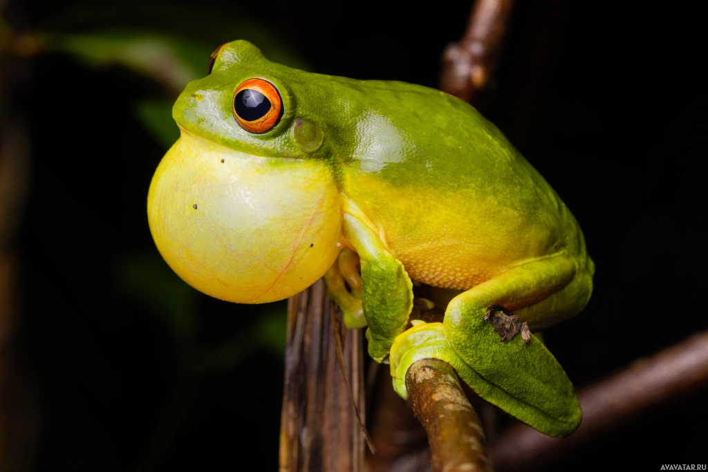 На картинке изображена зеленая лягушка с выпуклыми оранжевыми глазами. Она сидит на чем-то похожем на веточку, которая может быть частью дерева или кустарника в ее естественной среде обитания. Рот лягушки слегка приоткрыт, и она кажется настороженной, возможно, осознающей окружающее.