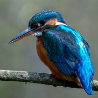 The image shows a bird, specifically a Common Kingfisher, perched on a branch. It's characterized by its large beak and colorful plumage with blue, green, and orange hues.