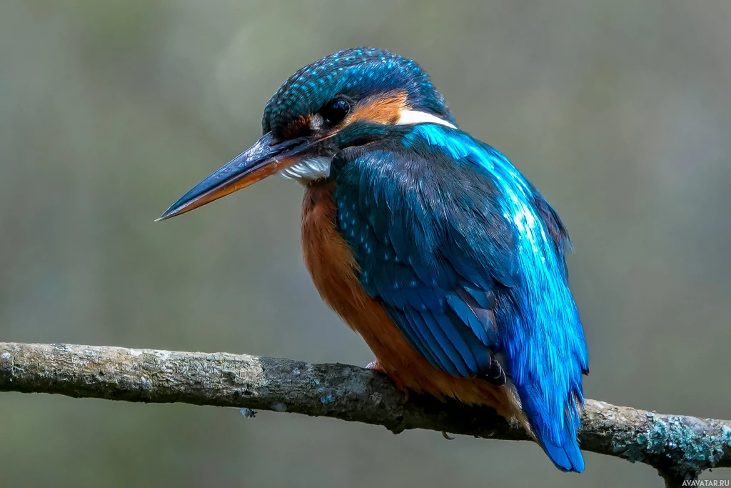На снимке изображена птица, а именно обыкновенный зимородок, сидящая на ветке. Птица отличается большим клювом и красочным оперением с синими, зелеными и оранжевыми оттенками.