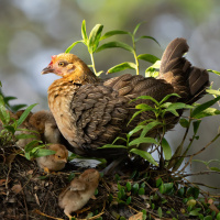 The image shows a mother hen with her chicks in the wild. She is perched on vegetation and appears to be watching over them, as they are tucked into the foliage for safety from potential predators. This scene captures a moment of natural behavior and interaction between the hen and her offspring, which would be part of their survival strategy in their environment.