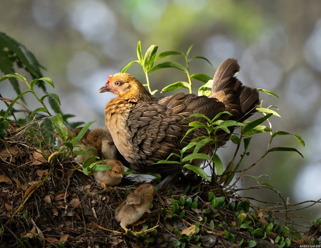 На картинке изображена наседка со своими птенцами в дикой природе. Она сидит на растительности и, кажется, наблюдает за ними, когда они прячутся в листве, защищая себя от потенциальных хищников. В этой сцене запечатлен момент естественного поведения и взаимодействия между курицей и ее потомством, что было бы частью их стратегии выживания в окружающей среде.