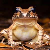 The image shows a frog. It appears to be in a natural setting with brown vegetation that might resemble the ground or leaves around it. The frog has distinct markings and patterns on its skin, which are characteristic of various species within the amphibian family.