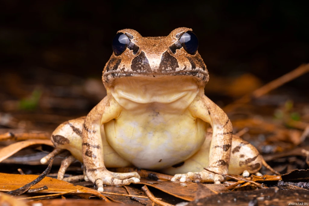 На картинке изображена лягушка. Кажется, что она находится в естественной обстановке, окруженная коричневой растительностью, которая может напоминать землю или листья. Лягушка имеет четкие отметины и узоры на коже, которые характерны для различных видов семейства земноводных.
