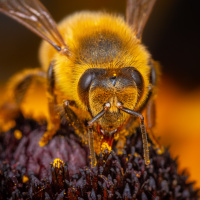 The image shows a bee, which is an insect and part of the animal kingdom. It appears to be engaging in typical bee behavior such as feeding or collecting nectar from a flower.