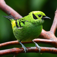 The image shows a bird with a bright yellow body, green feathers on the wings and tail, and black markings around the eyes. It appears to be perched on some branches, possibly in a natural or semi-natural setting.
