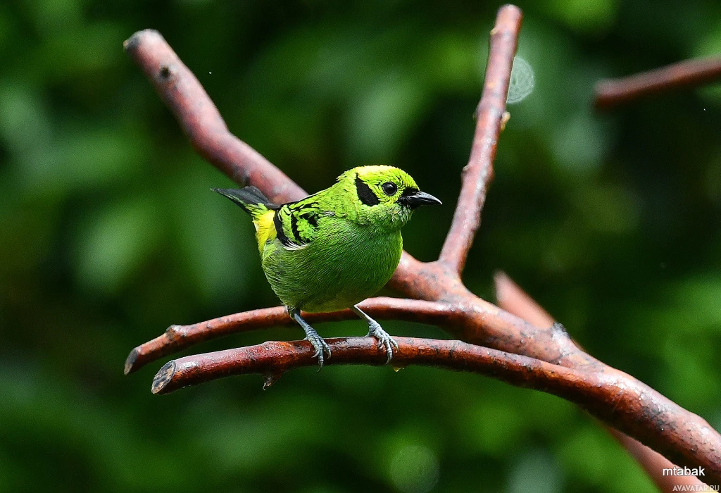 На картинке изображена птица с ярко-желтым телом, зелеными перьями на крыльях и хвосте и черными отметинами вокруг глаз. Кажется, что она сидит на ветках, возможно, в естественной или полуестественной обстановке.