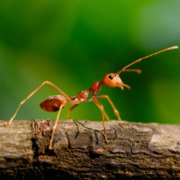 a thin branch or twig. The ant appears to be in motion, and its antennae are visible. It is an example of a close-up shot focused on the subject against a natural background that includes