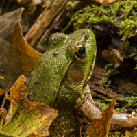 The picture features a green frog sitting on the ground. It appears to be in a natural environment with leaf litter and possibly some moss or moisture nearby, which is consistent with the type of habitat that many frog species prefer.