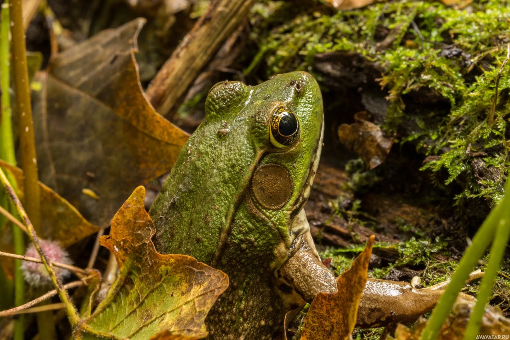 На картинке изображена зеленая лягушка, сидящая на земле. Судя по всему, она находится в естественной среде обитания, где поблизости есть опавшие листья и, возможно, немного мха или влаги, что соответствует типу среды обитания, которую предпочитают многие виды лягушек.