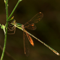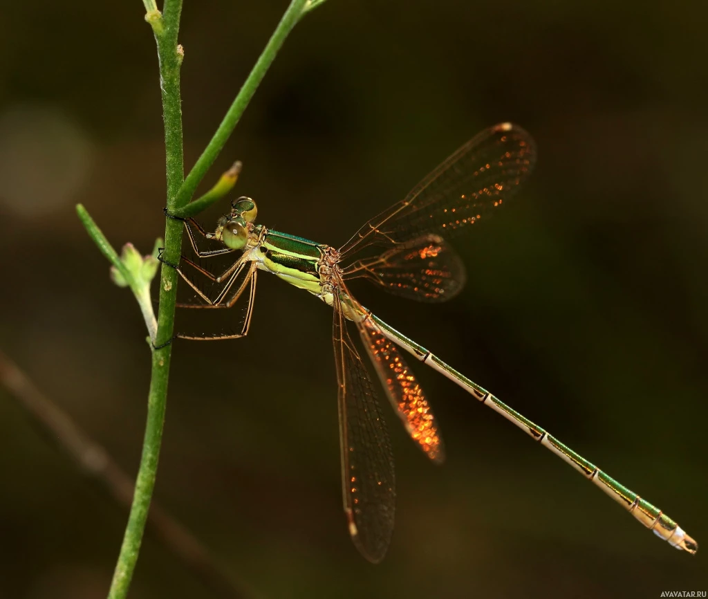 На картинке изображена стрекоза, сидящая на тонкой ветке или стебле. У нее длинные тонкие крылья и тело зеленовато-коричневой окраски с полосами различных оттенков. Стрекозы известны своей впечатляющей подвижностью в полете и часто встречаются вблизи водоемов.