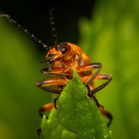 The picture shows a beetle, which is an insect. It appears to be on a plant with green leaves, and it's possibly feeding or resting on the foliage. Beetles are known for their hard exoskeleton, wings, and often bright colors like yellow or red.