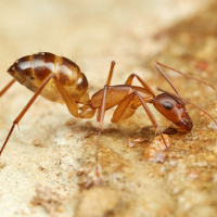На картинке изображено насекомое, в частности муравей, на поверхности, которая кажется грязной или песчаной. Муравей повернут лицом к правой части изображения, и видны его голова, грудная клетка и лапы. Похоже, он занимается какой-то деятельностью, которая может включать в себя копание или исследование почвы, на которой он стоит.